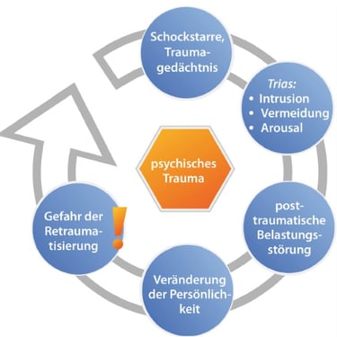 Die Posttraumatische Belastungsstörung (PTBS) ist gekennzeichnet durch: Intrusionen (gedankliches oder emotionales Wiedererleben: "Ich bekomme die Bilder nicht aus dem Kopf!"); Vermeidung (Vermeidungsverhalten) und plötzliches, unkontrollierbares Erleben von Arousal (körperlich-emotionale Stressreaktionen, auch in "ungefährlichen" Situationen). Auch "unpassende" Reaktionen wie Schuldgefühle oder nach innen gerichtete Wut (Selbstverletzung als Wendung gegen das Selbst) sind typisch.