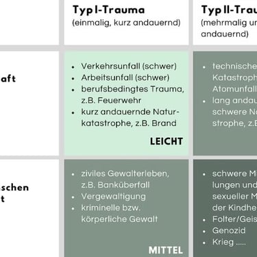 Wir unterscheiden verschiedene Trauma-Arten: Das Schocktrauma geht auf ein einmaliges Ereignis zurück (Typ-I), das Entwicklungstrauma auf mehrfaches bzw. langfristiges Erleben. Interessanterweise ist das subjektive Erleben und die Verarbeitung deutlich schwerer, wenn die Ursache interpersonell (also von einem Menschen mutwillig verursacht wurde) oder akzidentell ist (z.B. Naturkatastrophe).