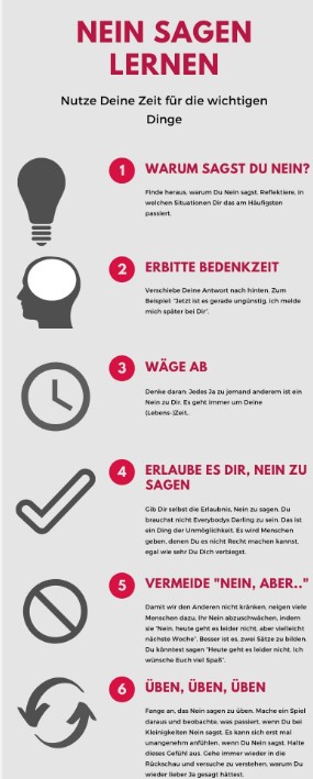 In der Kindheit war Widerspruch, Nein-Sagen und Für-Sich-Einstehen nicht oder nur sehr schwer möglich, da sie mit der Angst vor Bestrafung (z.B. Ablehnung, Nicht-Beachtung, Schläge) und der Angst vor Bindungsverlust einherging. Oft ist unbewusst eine Selbsterzählung entstanden: "Wenn ich andere enttäusche, dann werde ich nicht mehr gemocht - das muss unbedingt vermieden werden!" Diese Muster von dort und damals wurden zutiefst verinnerlicht und wirken im hier und heute fort. Doch was damals hilfreich war (Überlebensstrategie Anpassung und Es-anderen-Recht-Machen) kann uns heute schaden (mangelnde Selbstfürsorge)! Deshalb ist es wichtig zu verstehen: Ein ehrliches NEIN zu anderen kann ein wertvolles JA zu uns selbst sein! Wer zu anderen nie Nein sagt, tut dies ständig gegen sich selbst. Hier gilt es alte maladaptive Muster zu hinterfragen und schrittweise zu verändern.